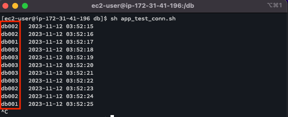 ์ ๋ช ๋ น์ด๋ฅผ ์คํํ์ฌ app_test_conn.sh ์คํฌ๋ฆฝํธ๋ฅผ ์คํํ๋ฉด, 3๋์ MySQL ์๋ฒ์์ ์์ ์ด ๋ถ์ฐ๋์ด ์ฒ๋ฆฌ๋๋ ๊ฒ์ ํ์ธํ ์ ์์ต๋๋ค. ๊ฐ๊ฐ์ ์ฟผ๋ฆฌ ๊ฒฐ๊ณผ์๋ ํธ์คํธ๋ค์๊ณผ ํ์ฌ ์๊ฐ์ด ์ถ๋ ฅ๋ฉ๋๋ค.