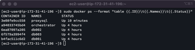 ๊ทธ๋ฆฌ๊ณ docker ps ๋ช ๋ น์ด๋ฅผ ํตํด ProxySQL ์ปจํ ์ด๋๊ฐ ์ ์์ ์ผ๋ก ์คํ ์ค์ธ์ง ํ์ธํ ์ ์์ต๋๋ค.