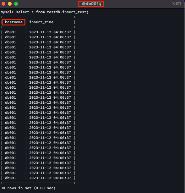 ์ ๋ช ๋ น์ด๋ฅผ ์คํํ์ฌ app_test_insert.sh ์คํฌ๋ฆฝํธ๋ฅผ ์คํํ๊ณ , db001์ ์ ์ํ์ฌ ํ ์ด๋ธ์ ์กฐํํด ๋ณด๋ฉด ๋ชจ๋ INSERT ์ฟผ๋ฆฌ๊ฐ db001์ ํตํด์๋ง ์ํ๋ ๊ฒ์ ํ์ธํ ์ ์์ต๋๋ค. ์ด๋ ProxySQL์ด ์ค์ ๋ ๋๋ก Write ํธ์คํธ ๊ทธ๋ฃน(db001)์ผ๋ก ๋ชจ๋ ์ฐ๊ธฐ ์์ ์ ์ ๋ฌํ๊ธฐ ๋๋ฌธ์ ๋๋ค.