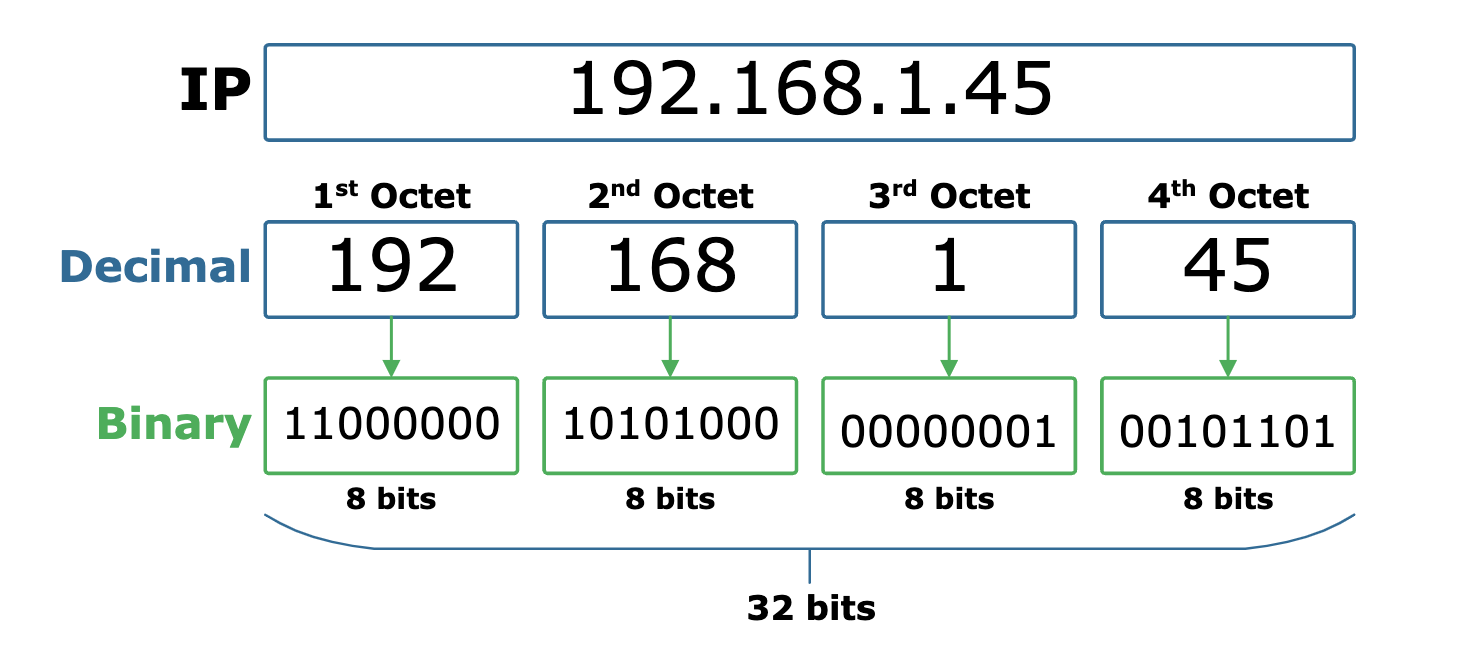 IP ์ฃผ์๋ ์ธํฐ๋ท์ ์ฐ๊ฒฐ๋ ๋ชจ๋ ์ฅ์น(์ปดํจํฐ, ์๋ฒ, ์ค๋งํธํฐ ๋ฑ)๋ฅผ ๊ณ ์ ํ๊ฒ ์๋ณํ ์ ์๋ ์ฃผ์์ ๋๋ค. ์ผ๋ฐ์ ์ผ๋ก 192.168.1.100๊ณผ ๊ฐ์ด ๋ง์นจํ๋ก ๊ตฌ๋ถ๋ 4๊ฐ์ ์ซ์๋ก ํํ๋๋ฉฐ, ์ ์ผ๋ก ๋ถ๋ฆฌ๋ 10์ง์ ํ์์ผ๋ก ํ์ํฉ๋๋ค. ๊ทธ๋ฆฌ๊ณ ์ด๋ฅผ 32๋นํธ ์ด์ง์๋ก ํํํ๋ฉด 11000000.10101000.00000001.01100100์ ๊ฐ์ด ํํํ ์ ์์ต๋๋ค. ๊ฐ ์ฅํ (octet)์ 8๋นํธ๋ก ๊ตฌ์ฑ๋์ด ์์ต๋๋ค.