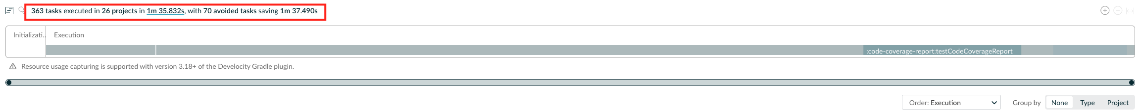 org.gradle.caching=true ์ต์ ์ ์ ์ฉํ ๊ฒฝ์ฐ, ๋์ผํ๊ฒ 363๊ฐ์ ํ์คํฌ๊ฐ ์คํ๋์์ง๋ง ์ด ์ค 70๊ฐ์ ํ์คํฌ๊ฐ ์บ์๋ก ์ฒ๋ฆฌ๋์๋ค. ๋๋ถ์ ์ฝ 1๋ถ 37์ด๋ฅผ ์ ์ฝํ์ฌ ์ ์ฒด ๋น๋ ์๊ฐ์ 1๋ถ 35์ด๋ก ๋จ์ถ๋์๋ค.