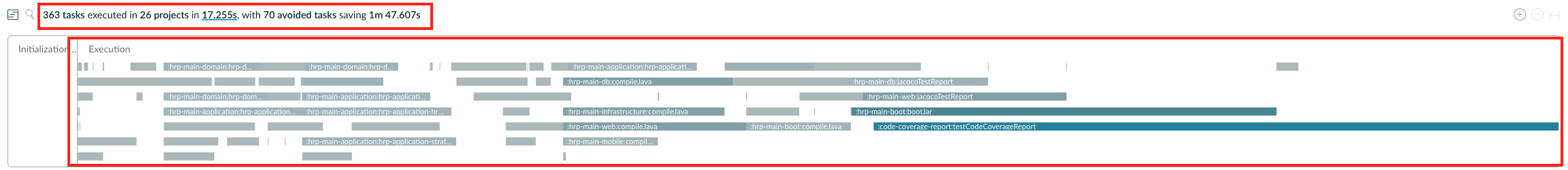 org.gradle.parallel=true ์ต์ ๊น์ง ์ถ๊ฐ ์ ์ฉํ ๊ฒฐ๊ณผ ๋ณ๋ ฌ ์ฒ๋ฆฌ๊ฐ ํจ๊ณผ์ ์ผ๋ก ์ด๋ค์ง ๊ฒ์ ํ์๋ผ์ธ์์ ํ์ธํ ์ ์๋ค. ์ ์ฒด ๋น๋ ์๊ฐ์ ๋จ 17์ด๋ก ์ฑ๋ฅ์ด ํ๊ธฐ์ ์ผ๋ก ๊ฐ์ ๋์๋ค.