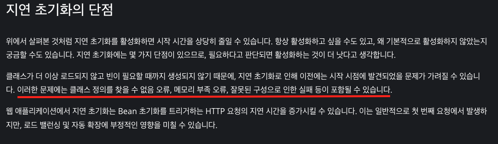 ๋ง์ฝ ๋ชจ๋ ๋น์ ์ง์ฐ ์ด๊ธฐํํ๋ ๊ฒ์ด ๋ถ๋ด์ค๋ฝ๊ฑฐ๋, ๋ฐฐํฌ ํ๊ฒฝ์์๋ ์ ์ฉํ๊ณ ์ถ๋ค๋ฉด @Lazy๋ฅผ ์ฌ์ฉํด ์ ํ์ ์ผ๋ก ํ ์คํธํด ๋ณด๊ณ ํ๋์ฉ ์ ์ฉํ๋ฉด ๋ ๊ฒ ๊ฐ๋ค.